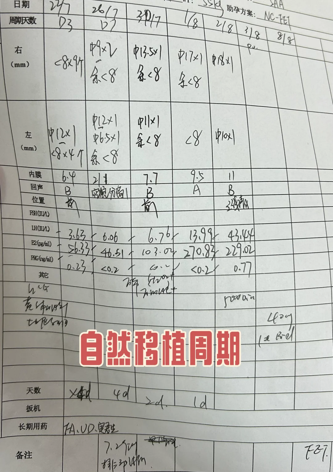 这次采用的是自然周期进周,用药确实少很多,定移植日之前都不用用药,定移植日开始,打了一针hcg破卵,然后每天40ml的黄体酮和每天2片地区孕酮,不用服用雌二醇。