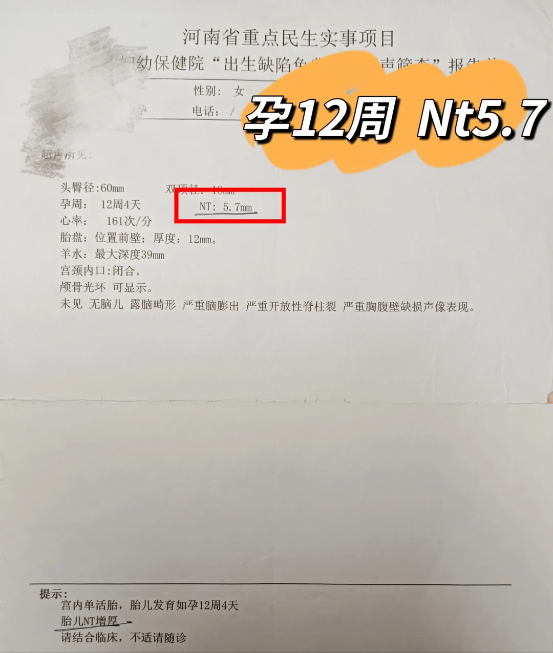孕12周:本来打算在家附近的医院直接建档的,但是B超检查的NT5.7医生说我的这个值超出了正常值很多,孩子有很大的概率是不健康的,让我们去河南省妇幼做产前诊断。