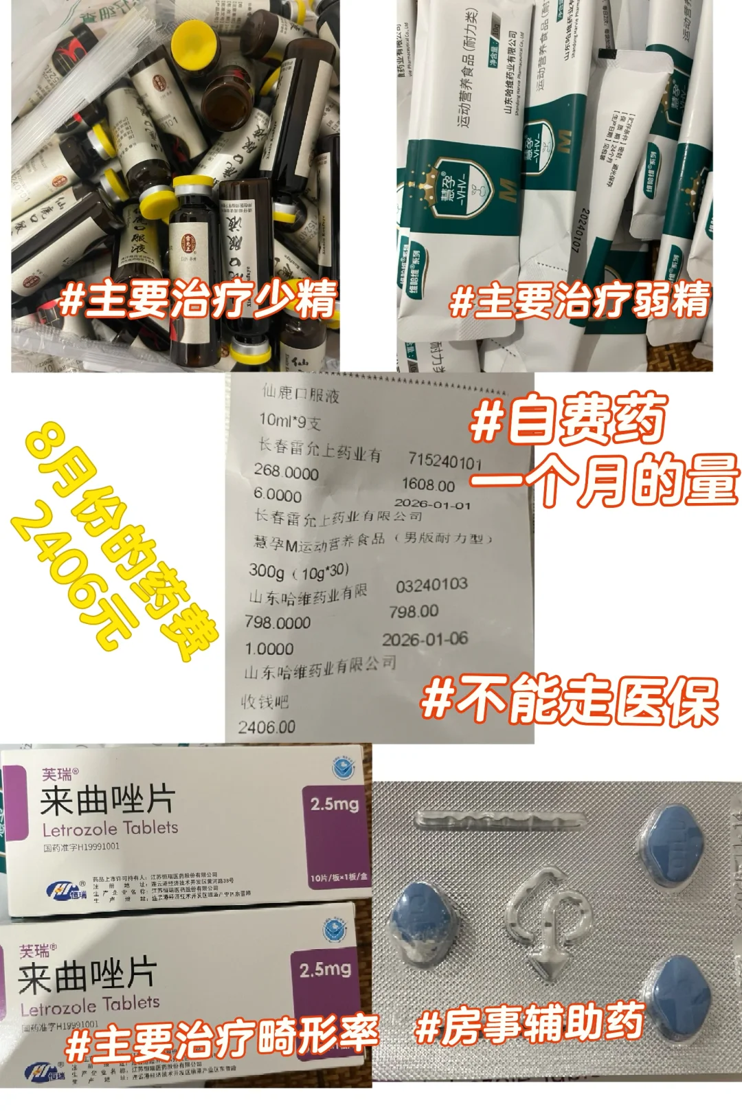 第二个月:精液检查畸形率没变化,医生把精氨酸胶囊换成了来曲唑,一盒20多元,一天一粒,左卡和仙鹿口服液没变,这个月药💊又花费了2400多元